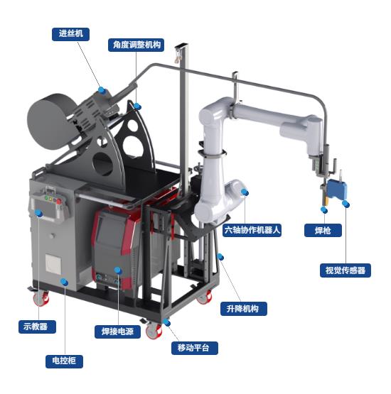 智能移動(dòng)焊接平臺(tái)專為工業(yè)焊接場(chǎng)景設(shè)計(jì),可為客戶提供快速布局的協(xié)作機(jī)器人焊接平臺(tái)。本平臺(tái)采用協(xié)作機(jī)器人作為運(yùn)動(dòng)機(jī)構(gòu),通過(guò)拖拽方式示教,降低了人工示教難度,并通過(guò)視覺引導(dǎo)技術(shù),工件夾持和示教過(guò)程均無(wú)需精確定位,由視覺自動(dòng)掃描完成焊縫起點(diǎn)、終點(diǎn)和焊縫軌跡的精確找尋。本平臺(tái)采用一體化設(shè)計(jì),包含焊接電源和綜合控制柜,可以實(shí)現(xiàn)靈活移動(dòng)和快速布局。適合小批量、多種類零件焊接,及大型鋼結(jié)構(gòu)零件焊接。